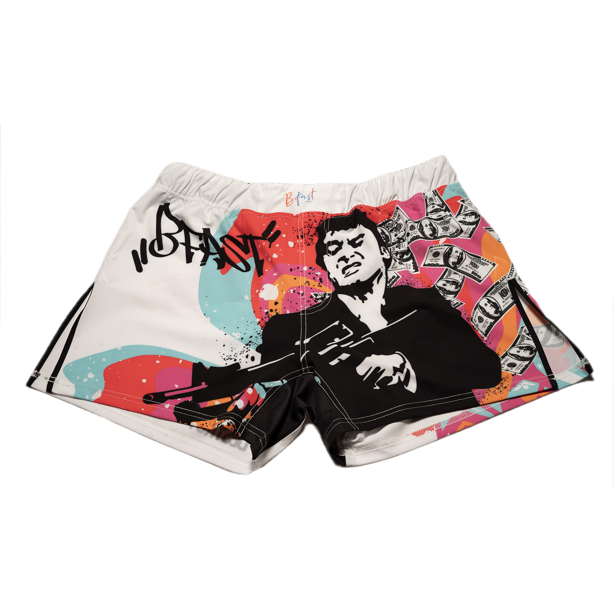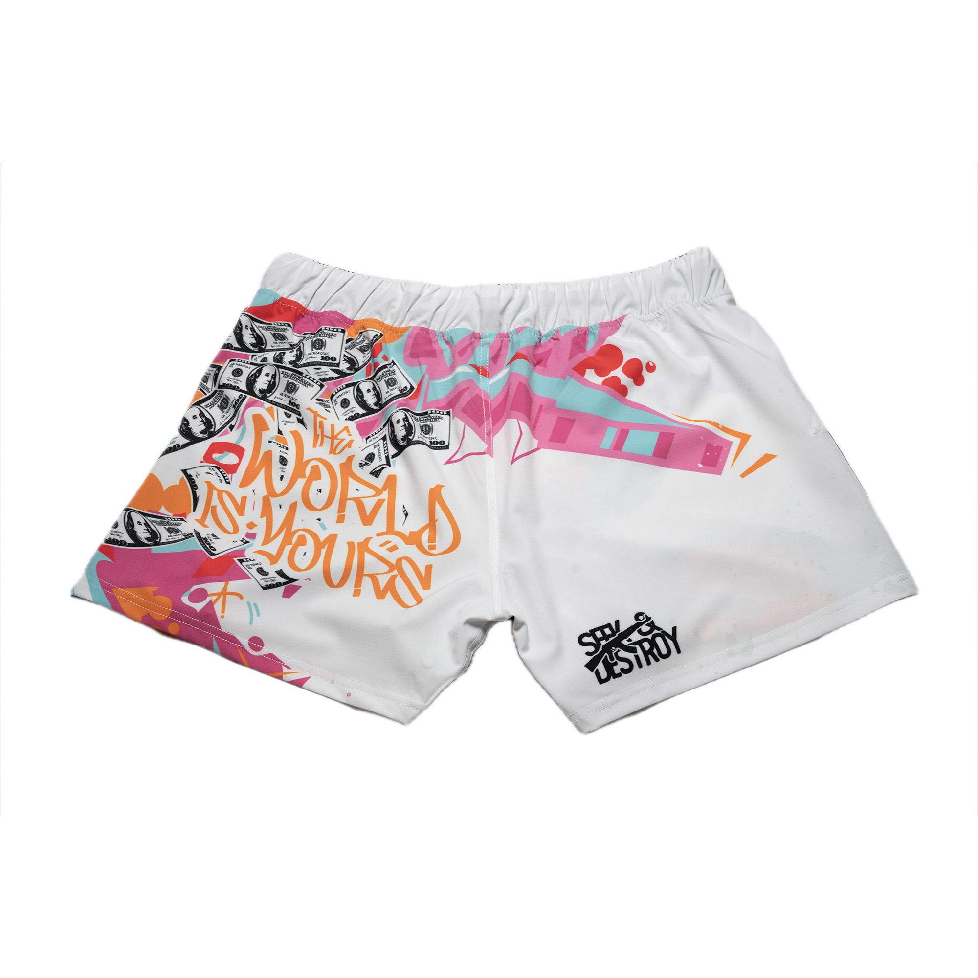 Make a bold statement in and out of the gym with these eye-catching fight shorts. Featuring a striking street-art design, the shorts showcase a high-contrast graphic of a fearless martial artist surrounded by flying money, graffiti accents, and the iconic phrase “The World Is Yours.” Vibrant splashes of color pop against a clean white base for an unmistakable, high-energy look.